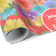 This personalized gift wrapping paper features an all-over pattern of elegant multicolor watercolor flowers. A coral red circle with a delicate white frame highlights customizable and personalized “Happy 30th Birthday” text at the center.