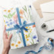 This gift wrapping paper features a watercolor wildflower pattern in shades of green, yellow, orange, and blue.