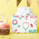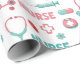 Charming seamless pattern wrapping paper featuring the word Nurse with medical essentials like stethoscopes, syringes, medicine bottles, and nurse cups on a clean white background. This playful healthcare-inspired design blends feminine colors with nursing-themed elements, making it ideal for nurses, nursing students, healthcare workers, and medical professionals.