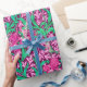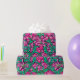 Papier à envelopper dans un William Morris, Art Nouveau, imprimé textile d'iris et de feuilles, numériquement rehaussé et coloré, en fuchsia et rose glace, vert paon et blanc, sur un vin profond violet arrière - plan