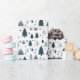 Papier d'emballage de Noël bleu de forêt enneigé dessiné à la main avec des pins de Noël géants dans différentes nuances de bleu avec des flocons de neige, des fleurs d'hiver et des étoiles.