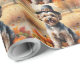 Un tableau aquarelle d'un chien gai assis au milieu d'un tas de feuilles d'automne vibrantes, entouré de minuscules citrouilles et de glands épars. Le chien porte un petit casquette pèlerin et des poutres de joie, capturant l'esprit de Thanksgiving. Dans l'arrière - plan, les champs de moissons et les arbres dorés créent une ambiance campagnarde paisible. Des textures douces et des tons d'automne chauds et feutrés confèrent à la scène une atmosphère cosy et nostalgique parfaite pour célébrer la beauté de la saison.