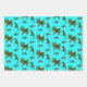 Mer étoiles feuilles de papier d'emballage Noël en bleu aqua tropical. Chaque feuille de papier a un motif différent mais toutes comprennent une étoile de mer ou une étoile de mer brune, enveloppée dans un saint vert avec des baies rouges. Une feuille a un motif plus petit tandis que l'autre a un grand motif. La troisième feuille comprend les chevaux de mer dans la conception. La couleur arrière - plan est la même bleu vif sur les trois feuilles. Le thème de la vie marine est parfait pour offrir des cadeaux dans un climat chaud.