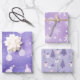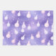 Papier d'emballage de vacances violet pastel avec lumières, flocons de neige et arbres