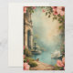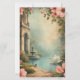 Un design de papeterie qui ressemble à une entrée dans un rêve. La scène s'ouvre sur une cour baroque ornée, encadrée par des arches en pierre sculptée et des fioritures architecturales délicates qui évoquent les jardins européens séculaires. Au centre, une fontaine d'eau gracieuse brille d'un éclat doux et nacré, ses douces cascades ajoutant une sensation de sérénité et de mouvement.