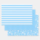 Trois motifs en bleu ciel clair et blanc : rayures de base, pois et taches aléatoires.