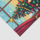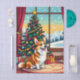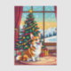 An adorable Christmas tissue paper with a festive Corgi sitting in front of the fireplace on a cold winter day. A Christmas tree decorated and a festive background.