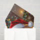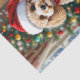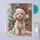 An adorable Christmas tissue paper with a festive poodle sitting in front of the fireplace on a cold winter day. A Christmas tree decorated and a festive background.