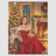 A Christmas tissue paper with vintage vibes. A mid-century woman in a retro holiday dress sitting by a lit up Christmas tree and fireplace.
