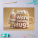 A charming and sweet 3D render or miniature photograph featuring an adorable, fluffy beige felt gnome standing next to a large, textured fabric mug. The gnome has a large white beard, pink cheeks, and a beige knitted hat. The oversized mug is labeled with the message "Warm Holiday Hugs" in white, marshmallow-like letters, and is overflowing with soft white marshmallows. The scene is set against a warm, soft ochre background, emphasizing the cozy, comforting, and whimsical nature of the image.