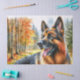 Ce papier de tissu à thème naturel présente l'aquarelle d'un chien berger allemand en plein air à l'automne, indiquée par les feuilles rouges, oranges et jaunes sur les arbres dans les bois. Le chien est détendu mais attentif, sa langue traîne, en regardant de côté. Idéal pour les grands amoureux de les chiens et les propriétaires de chiens ! Et parfait pour la saison d'automne.