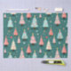 Des couleurs amusantes décorent de mignons petits arbres de Noël qui défilent sur ce papier de tissu au coeur léger. Un arrière - plan bleu turquoise foncé et vert se trouve derrière les arbres festifs colorés qui apparaissent en rose, bleu clair, avec des étoiles jaunes et des billes multicolores. Ils sont d'un motif d'aquarelle rétro.