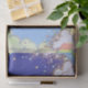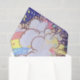 De jolis nuages pastel en rose, vert, jaune et violet, contre un ciel d'été bleu avec un arc-en-ciel et papier de tissu confetti. Parfait pour les anniversaires.