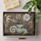 arrière - plan en bois Brown avec mer, crête mécanique, volant antique, ancre dorée et divers engrenages en or et laiton. Style Steampunk.