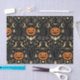 A dramatic Art Deco–inspired Halloween repeating pattern set against a deep black background, featuring sleek, stylized black cats with glowing green eyes arranged in a bold, symmetrical rhythm. Classic Halloween motifs—jack-o’-lanterns, crescent moons, bats, spiders, spiderwebs, witches’ hats, and sparkling geometric stars—are rendered in refined Deco forms with clean lines and elegant contrast. A limited palette of inky black, warm pumpkin orange, champagne gold, and soft ivory creates a glamorous, nocturnal mood that feels luxurious and sophisticated rather than playful.