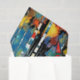 Un chat fantaisiste aux allures de vitraux géométriques se dresse dans une forêt de bouleaux très animée. L'arrière - plan présente un mélange coloré de feuilles d'automne et de tons bleus et jaunes. Photoshop Art numérique