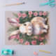 Le papier de tissus présente l'aquarelle d'un mignon lapin lapin encadré de fleurs roses dans ce portrait d'animal botanique floral.