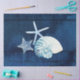 "Beach Ocean Sea Shells Seashells Navy Blue White Tissue Paper, poids lourd pour le découpage ou l'emballage cadeau." Une paire d'étoiles de mer et une coquille de Nautilus sur un arrière - plan en bois bleu marine ont été élégamment peintes à la main dans des aquarelles par l'artiste et designer de renommée internationale Audrey Jeanne Roberts, copyright