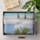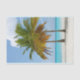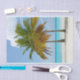 Papier de tissus avec une belle et tranquille photo de 2 palmiers sous un ciel bleu vif. Situé sur une plage tropicale isolée avec une eau turquoise et calme.