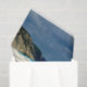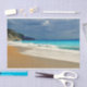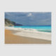 Papier de tissus avec une belle photo représentant une mer bleu turquoise et une plage de sable avec des vagues de surf mousseux.