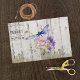 Belle libellule violette lavande sur bois blanc patiné et rustique, aux fleurs roses et violettes. Un signe "Fresh Flower Market" à gauche de la libellule. Parfait pour les fournitures artisanales de découpage ou les fournitures d'emballage cadeau.