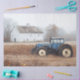 Une oeuvre numérique de style vintage, avec un tracteur bleu classique près d'une grange à champs ouverts, évoquant le charme nostalgique de la campagne.