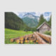 Un mignon petit cabine foudroyé dans une prairie d'été avec une forêt dense et une montagne dans l'arrière - plan et un tas de longues rondins dans un gros plan