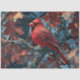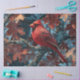 Un cardinal rouge vif est installé sur une branche entourée de feuilles de chêne d'automne richement colorés. Le feuillage complexe et les textures détaillées créent une scène naturelle époustouflante qui met en valeur la beauté de l'oiseau et une atmosphère saisonnière.