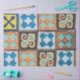 Décor de carrelage méditerranéen traditionnel peint à la main. Motifs de perfection. Motifs géométriques dans les tons bleu, orange, marron et jaune. Le design décoratif parfait qui fait pour un cadeau de Noël idéal, cadeau d'anniversaire, décoration de pépinière, chambre d'enfants, décor maison ou pour toute occasion. Design contemporain moderne.
