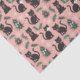 De mignons chats de Noël fêtent la fête avec vous sur ce papier de tissu fin. Les chattes amusantes, surtout noires, s'amusent entre les arbres verts de la rivière, les branches à feuillage persistant et les flocons de neige blancs sur un arrière - plan rose. Ceci est un caprice d'une illustration rétro pour vos efforts d'emballage cadeau pour les amoureux de les chats de votre liste de cadeaux Yuletide.