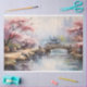 Belle aquarelle printanière illustrant un jardin fleuri de cerisiers, un étang calme, un pont voûté et une architecture traditionnelle japonaise entourée d'un environnement naturel riche et paisible.