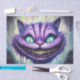 This decoupage paper features a Cheshire Cat illustration with a wide grin, glowing teal eyes, and bold purple coloring. The artwork is inspired by Alice in Wonderland–style fantasy and has a gothic, surreal, dark whimsical look with dripping paint effects.