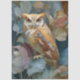 Une chouette stylisée aux yeux expressifs et aux motifs de plumes brun-orange complexes est assise parmi des feuilles en couches dans les tons bleu, vert et rouille muet.