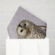 Un hibou européen sur un bouleau avec un cachet français et un design rouge orné dans l'arrière - plan à motifs rouges. Utilisez pour vos projets de découpage à thème oiseau.