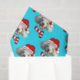 Make your own Santa Dog Christmas tissue wrapping paper with your dog's face for a unique gift wrapping pattern. Simply replace the current dog photo with your dog's cut out face photo to view it wearing a Santa hat with a red and white striped scarf. You can easily cut a photo of your dog's face in most popular apps and graphic design software. It's helpful to have several sizes available on a transparent background to upload to ensure a good fit with the Santa hat and scarf drawing. Experiment with different sizes to see what fits best. You can also select your favorite background color instead of the blue shown here. Just click on the background layer to choose any color you like from the color palette. This cute tissue gift wrap with a pet dog's face and Merry Woofmas message on the hat is sure to add a festive touch to any dog lover's gifts or wrap a gift for your dog! Great for using in gift bags and decorating, too.