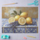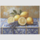 Une délicate peinture à vie morte, composée de citrons et de lavande contre les carreaux bleus décoratifs, alliant élégance classique et charme rustique.