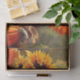 Citrouilles de nombreuses couleurs entourés de beaux tournesols avec un arrière - plan bordé d'arbres.