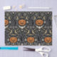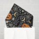 Un motif répétitif d'Halloween inspiré de l'Art déco, sur fond noir profond, présentant des chats noirs élégants et stylisés aux yeux verts lumineux disposés selon un rythme audacieux et symétrique. Les motifs classiques d'Halloween - citrouilles, lunes croissantes, chauves-souris, araignées, toiles d'araignée, chapeaux de sorcière et étoiles géométriques scintillantes - sont représentés sous des formes raffinées de style Art déco avec des lignes épurées et un contraste élégant. Une palette limitée de noir d'encre, d'orange citrouille chaud, d'or champagne et d'ivoire doux crée une ambiance nocturne et glamour qui se révèle luxueuse et sophistiquée plutôt que ludique.