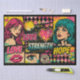 This decoupage paper features a bold comic pop art collage with women’s faces, lips, and eye illustrations in a high-contrast graphic style. The design includes the words “Love,” “Strength,” and “Hope” layered over harlequin diamond patterns, hearts, and grunge paint textures.