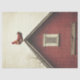 Pièce d'art animée d'un coq perché avec confiance sur le toit d'une grange rouge, incarnant l'essence spirituelle des matins de pays.