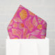 Les coquillages de ce papier de tissu sont colorés dans les tons coralliens, roses, oranges et violets sur un arrière - plan rose. Idéal pour les amateurs de plage !