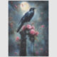 Un corbeau saisissant se dresse sur une tombe recouverte de mousse entourée de roses roses vives, tandis que la pleine lune illumine la scène sereine et mystique.