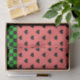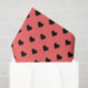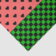 La feuille de papier de tissu lunaire est composée de motifs de coeurs rose pastèque et noir avec bordure inférieure en damier vert foncé.