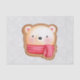 Papier de tissus avec un visage d'ours mignon et adorable posé sur une base de biscuits. Portant un foulard rayé rouge et blanc. Arrière - plan est un motif qui a l'air de tomber la neige, en argent et blanc.