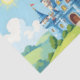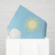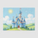 Cute blue and white castle with red flags on a bright summer day. This beautiful whimsical illustration with the sun, clouds, blue sky and green hill grass.
