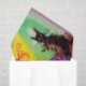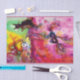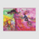 Personnage de mascarade coloré, fantaisiste et artistique, Peinture à l'aquarelle avec des couleurs vives en rouge, rose, vert, jaune, paillettes dorées. Personnage inspiré de la Commedia dell'Arte et du Carnaval de Venise et des masques à plumes vénitiens.