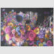 This unique decoupage design features an intricate human skull enveloped in vibrant flowers, blending elements of life and death in a striking visual contrast. The skull itself is adorned with delicate floral patterns, while larger blooms like roses, daisies, and peonies surround and intertwine with the skeletal structure, creating an ethereal yet thought-provoking aesthetic. The dark background amplifies the brilliance of the flowers, making their colors pop with intensity.