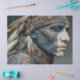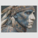 Une présence commandante rayonne de ce portrait d'un chef guerrier indien américain, dont le visage est peint en contraste symbolique, d'un côté blanc craqué, d'un côté bleu céleste avec des coups de soleil dorés de l'autre. Cette dualité reflète à la fois la force terrestre et la sagesse spirituelle. Sa coiffure élaborée, ornée de plumes, de perles et de textures tissées, le couronne de fierté ancestrale et d'honneur cérémonial. Chaque détail de sa tenue vestimentaire, de l'incrusté de la tête aux tissus superposés, parle de leadership, d'héritage et du devoir sacré de protéger et de guider. Il n'est pas seulement une figure de la tradition, mais aussi une incarnation vivante du courage, de la culture et de la connexion avec la terre et les étoiles. découpage art indien, art guerrier indien américain, portrait en chef tribal, conception de la peinture faciale, imagerie de coiffure plumée, vêtements culturels autochtones, symbolisme spirituel du leadership, scène du patrimoine artisanal, motif tribal céleste, beadwork et plumes traditionnels, représentation ancestrale sacrée.
