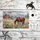 L'image montre deux chevaux broutant dans une prairie remplie de fleurs sauvages. Le cheval au premier plan est brun avec une bande blanche sur le visage, entouré de marguerites et de fleurs colorées. Au milieu, un autre cheval broute près d'une grange rouge avec un toit patiné. L'arrière - plan présente des arbres et des montagnes bleues lointaines sous un ciel légèrement nuageux. La peinture a une finition texturée et vintage qui ajoute à son charme rustique. Cheval rustique de prairie, image de cheval de campagne fleur sauvage, grange de ferme et peinture de cheval, scène de cheval pastorale avec montagnes, photo de pâturage de cheval vintage, papier découpage de cheval de campagne, cheval brun avec rayures blanches, grange rouge paysage rural imprimer, modèle de pré de cheval texturé, décoration de nature équine artisanale