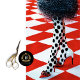 Ajoutez une touche audacieuse d'art avant-gardiste à votre espace avec cette impression artistique accrocheuse et vibrante. Cette image saisissante capture l'essence d'une sophistication ludique, présentant un gros plan de jambes ornées de bas à pois associés à de superbes chaussures à talons hauts. Les pois noirs et blancs créent un contraste dynamique sur le sol à carreaux rouge vif et blanc, faisant de cette pièce un véritable festin visuel.